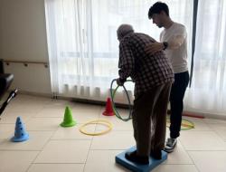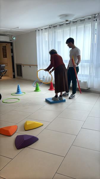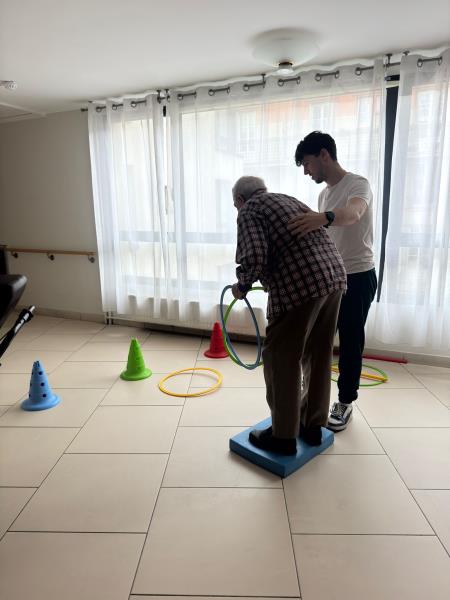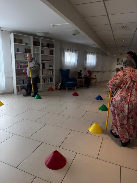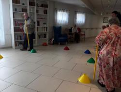 Le parcours était composé d'un circuit avec obstacles pour travailler l'équilibre et de 3 cônes à viser avec des cerceaux pour travailler la précision. Enfin, les résidents tenaient une barre dans chaque main représentant les bâtons de ski ⛷