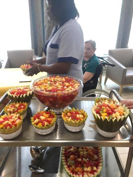 Pour lutter contre le mauvais temps, nos aides-soignantes Marieme et Béatrice ont animé un atelier salade de fruits après être allé les acheter au marché hier matin. Les résidents ont épluché et coupé pommes, kiwis, bananes...